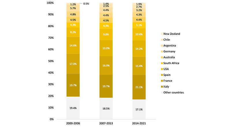 Il n’est pas surprenant que la France reste le premier producteur mondial de rosé, et sa proportion dans la production totale a en fait augmenté depuis 2000, passant de 24,4 pour cent à 31,9 pour cent. La France est suivie par l’Espagne et les États-Unis, ce qui pourrait témoigner de la récente obsession des États-Unis pour le rosé.